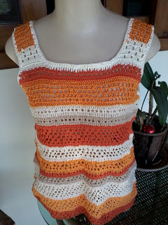 Linda blusinha (camiseta), trabalhada em crochê com linhas Natália e Princesa em lindos tons de laranja, vermelho, creme e bege.